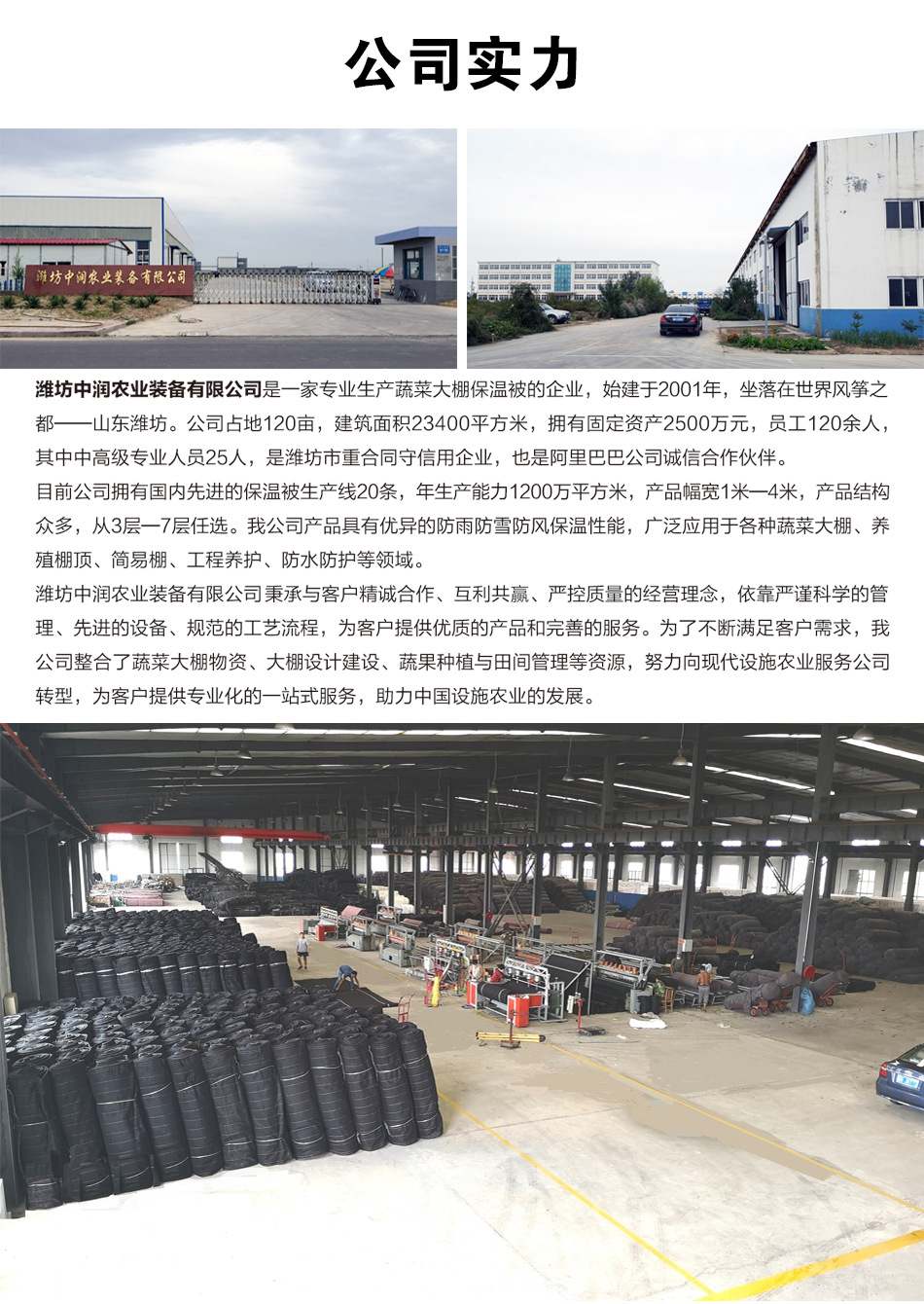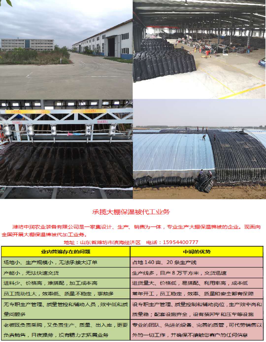 濰坊中潤(rùn)農(nóng)業(yè)裝備有限公司,專注大棚保溫被20年,140畝現(xiàn)代化研產(chǎn)基地,日產(chǎn)8萬(wàn)平方米,年產(chǎn)10萬(wàn)余噸。工廠位于,山東省濰坊市濱海經(jīng)濟(jì)開(kāi)發(fā)區(qū)。